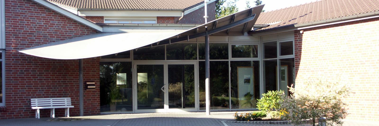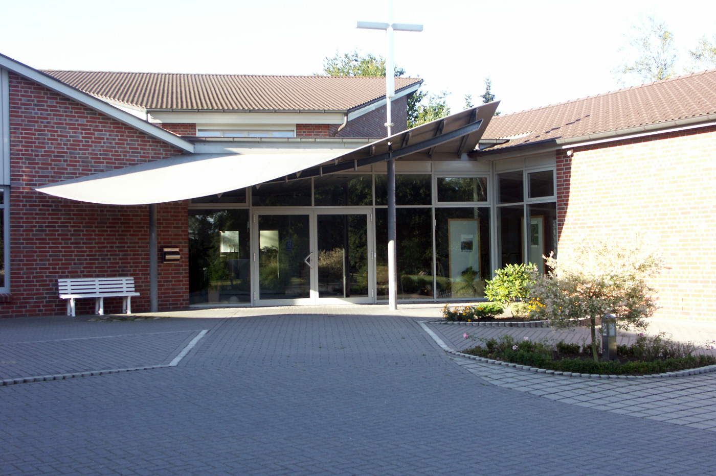 Architektonischer Clou des Gemeindezentrums der Freien ev. Gemeinde ist die geschwungene Eingangsüberdachung aus Leichtmetall, die schützend seine Besucher empfangen möchte. So wurde hier das Anliegen des Bauherrn architektonisch umgesetzt.