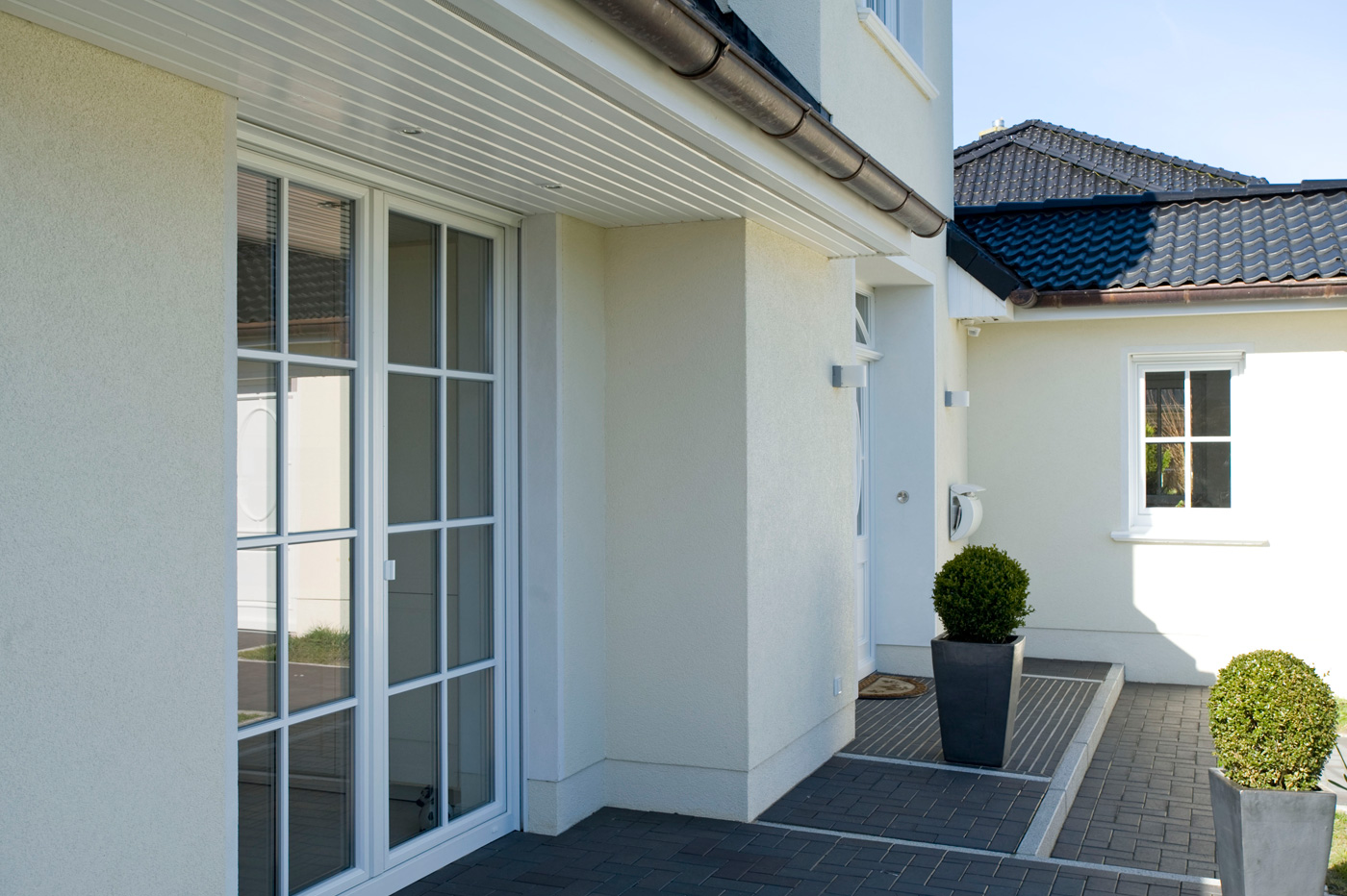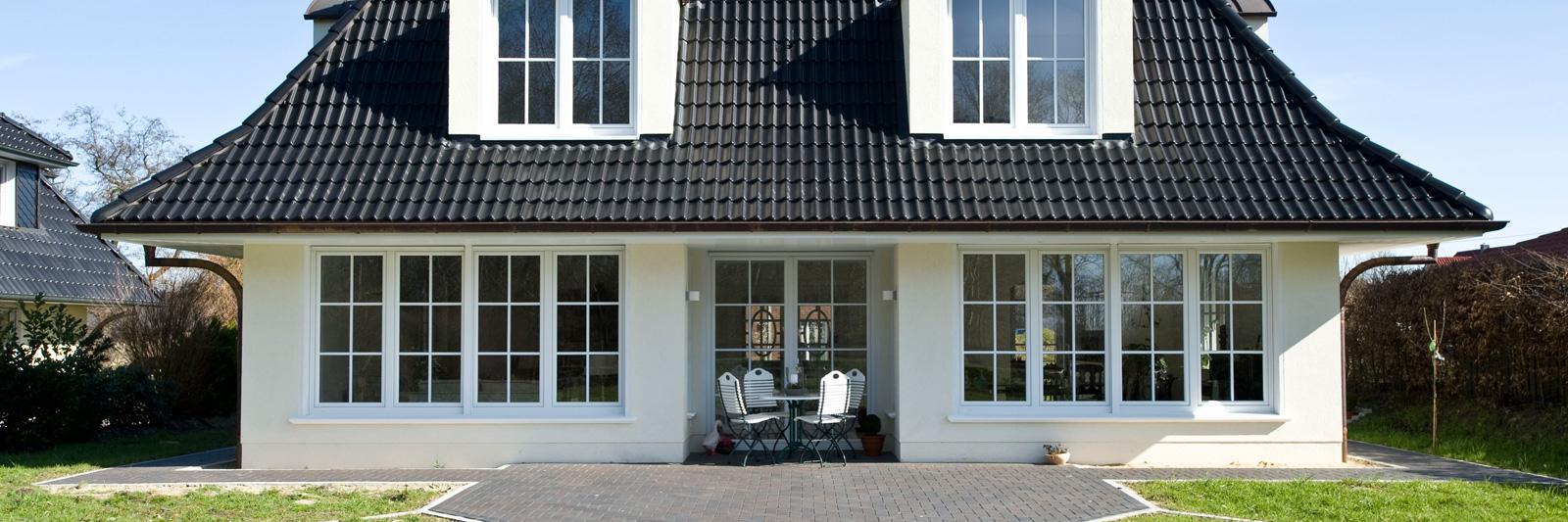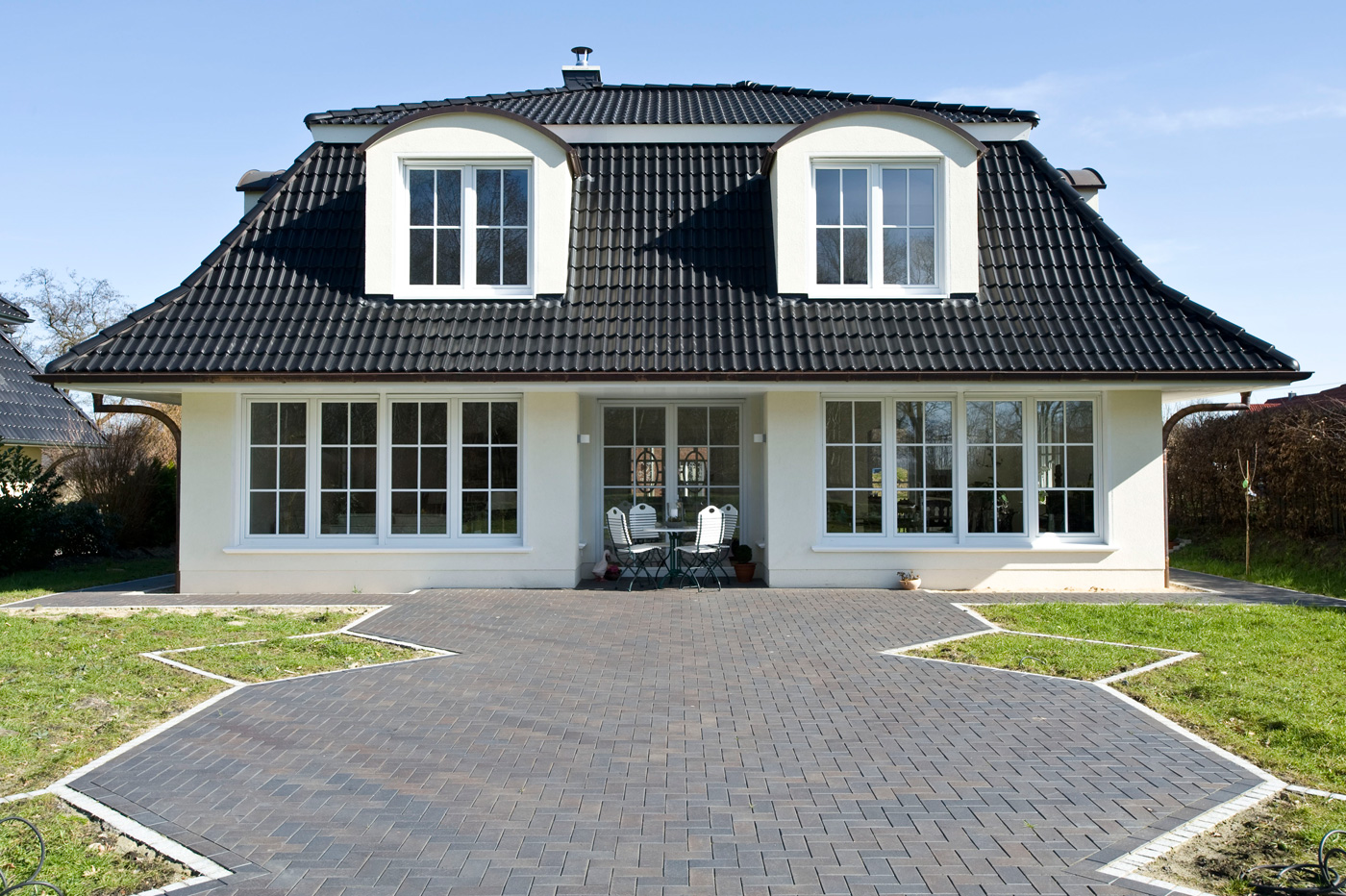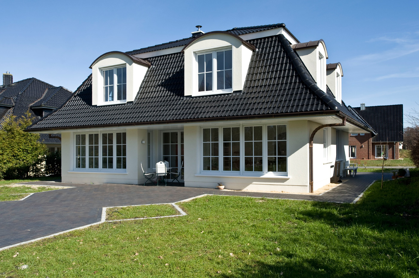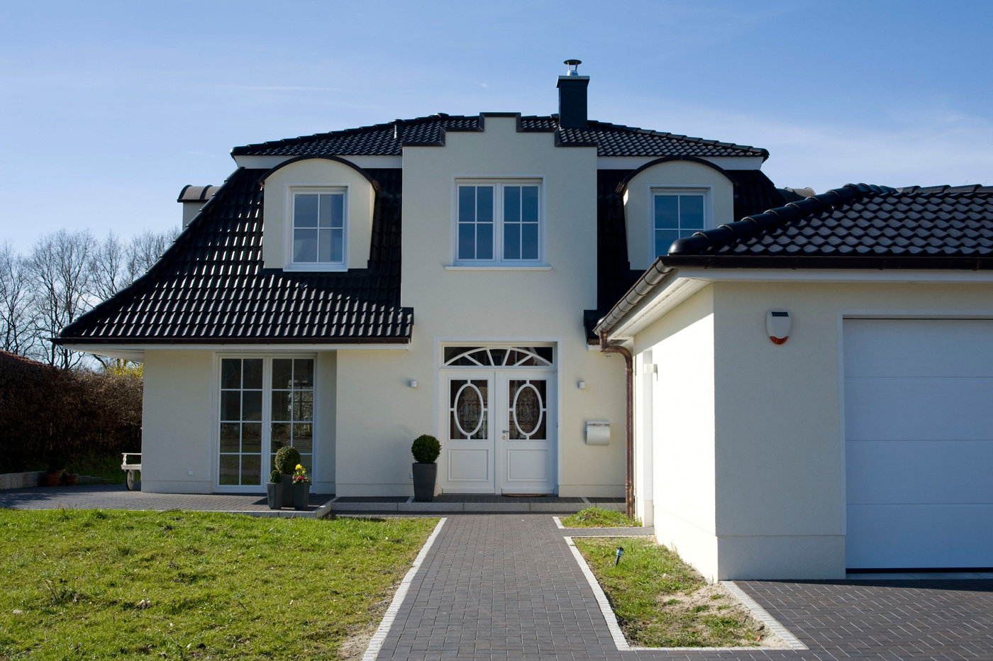 Das gegliederter Mansarddachhaus präsentiert sich in beeindruckender Gestalt mit Stilgauben und imposanten Hauseingangsgiebel.